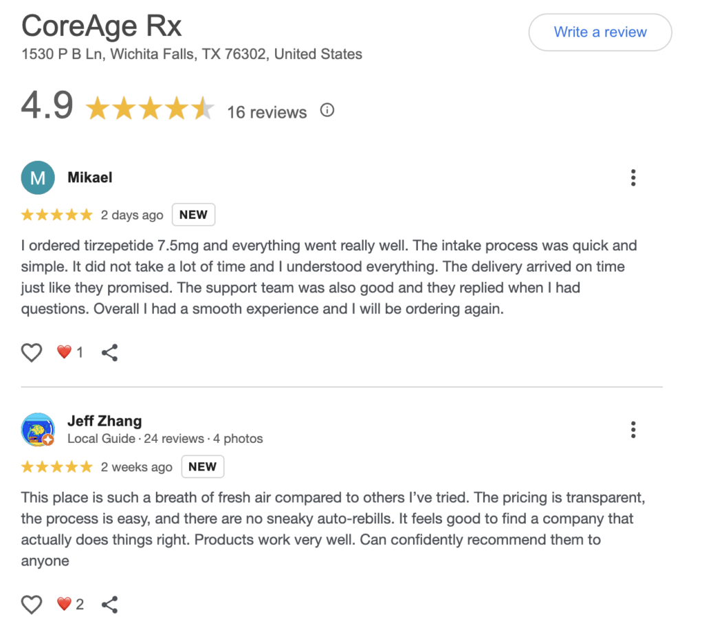 A surprising trend is the amount of interest in “coreage rx wichita falls” and “coreage rx wichita falls reviews.” CoreAge Rx isn’t limited to one location—it serves patients across many states—but the Wichita Falls area appears to have a growing demand for telehealth weight-loss options. Some local users even compare it with traditional Wichita Falls pharmacy choices and note that CoreAge Rx usually offers better pricing and more convenient delivery to their homes.
